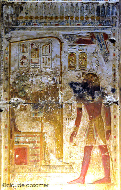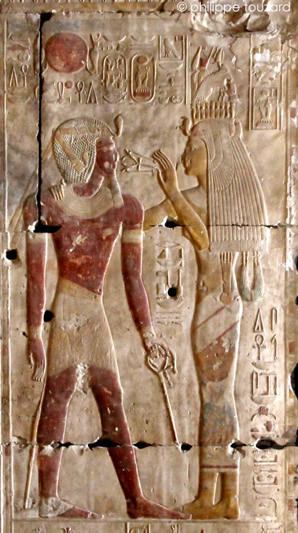 Hathor-Nebet-Hetepet tend un signe ankh entouré de deux signes ouas, symboles de puissance, au roi. Elle lui donne le souffle de la vie. Elle porte une dépouille de vautour sur la tête. |