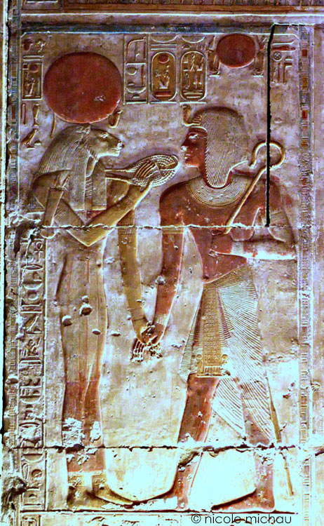 | La déesse Sekhmet parèdre de Ptah tend le signe ankh, c'est-à-dire vie, à Sethy 1er. La déesse porte le disque solaire avec l'uraeus. |