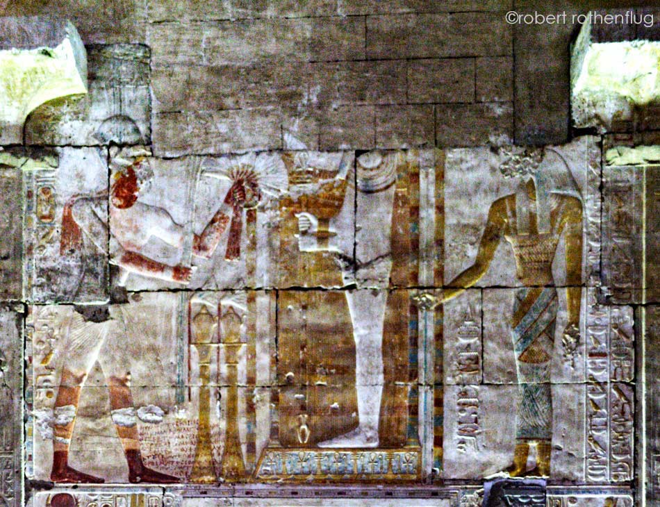Cette partie de la paroi est placée entre les chapelles de Sethy 1er et Ptah. La scène du haut est tronquée, mais on voit Sethy 1er offrir des fleurs à Ptah qui se trouve dans un naos. Derrière le naos, la déesse Sekhmet., parèdre de Ptah. |