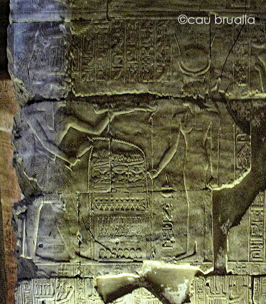 Le roi fumigène de l'encens et verse une libation pour purifier les offrandes qu'il adresse à Isis qui lui donne la royauté d'Horus éternellement.