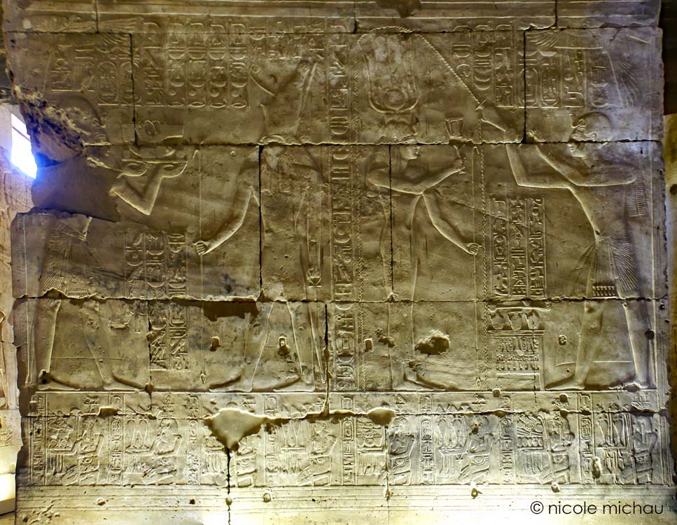 Registre du bas : à gauche, le roi présente le collier Ousekh à Horus qui lui donne toute vie, stabilité et santé. En dessous, des représentations de nomes de Basse Égypte.