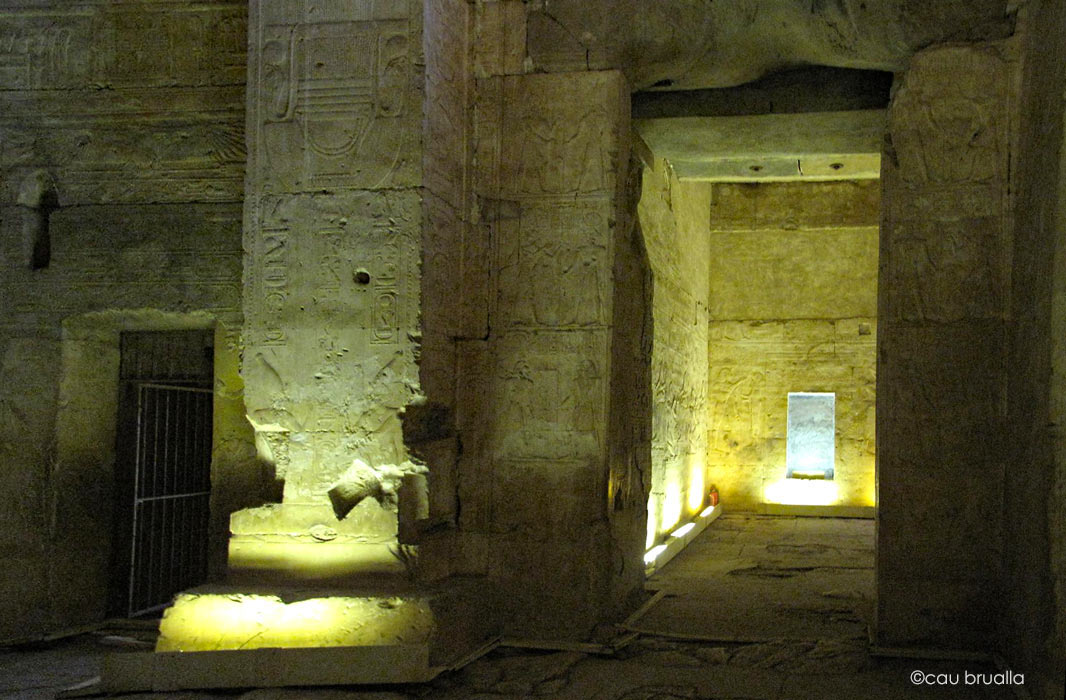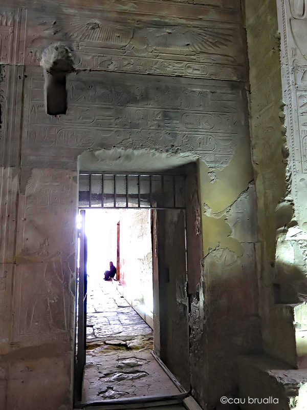 | À droite, la porte donne accès au complexe de Nefertoum-Sokar comprenant un grand hall dédié à Sokar et deux chapelles. À gauche, la porte ouvre sur le couloir où se trouve la liste des rois, la chapelle des bouchers, la chapelle des barques et la sortie au jour. Entre les deux portes, un autre pilier Djed. |