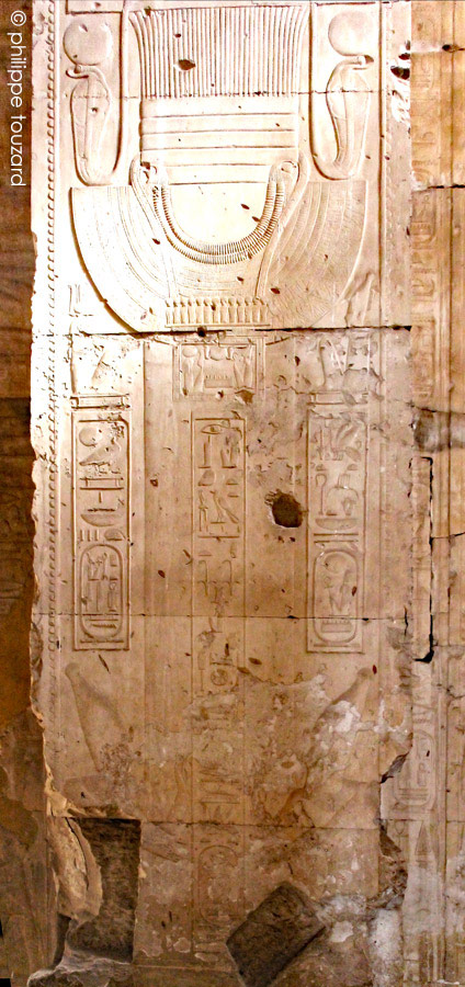 | Sous le vautour et sur le linteau, se trouvent plusieurs invocations commençant par les mots : "Que vive..." suivis des différents nom du roi Sethy. Sur chaque montant, une représentation du roi invite à entrer dans le couloir à condition que le visiteur soit pur. |