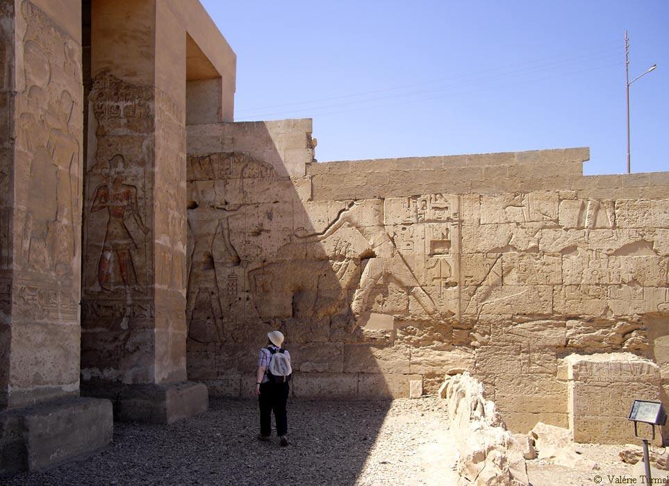 Scène B : cette scène se trouve près du portique dont on voir deux piliers sur la gauche. A droite, la scène C et en dessous de la scène C la stèle que vous pouvez voir en gros plan en cliquant dessus. La scène B représente le roi Ramsès II anéantissant ses ennemis devant Amon-Rê qui tient une épée recourbée. Derrière le roi, son ka. La scène A du mur nord est présentée avec le portique.