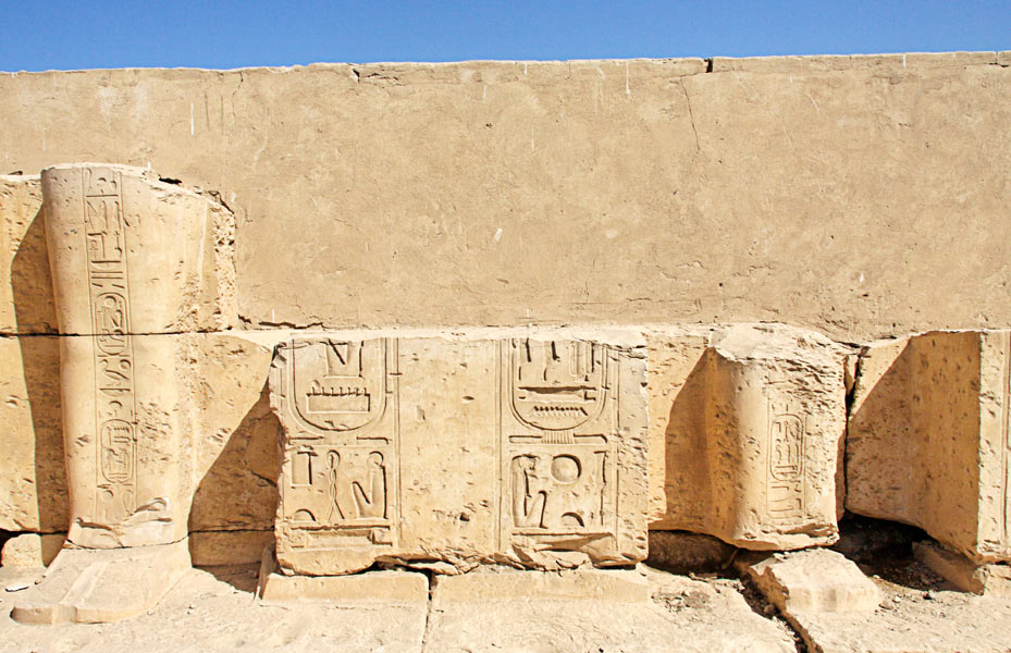 A gauche, le pilier de droite de la photo précédente. Sur le panneau, le nom de Amon-Ré à gauche et celui de Atoum à droite. Trois des têtes des piliers seraient entreposées dans la 1ère salle hypostyle (têtes des piliers).