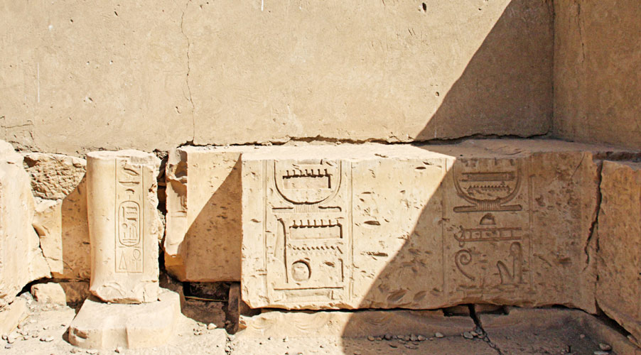 A gauche, le pilier de droite de la photo précédente. Sur le panneau, le nom de Mout à gauche et celui de Khonsou à droite.