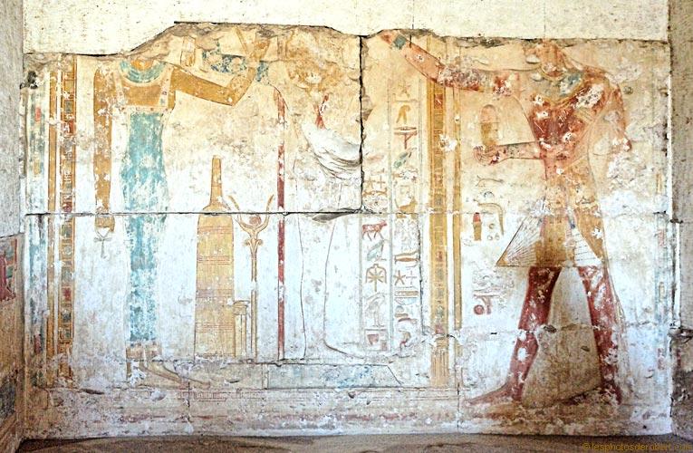 Chapel K, north wall : The king anoints the god Min with ointment. Behind Min, it is maybe the goddess Seshat of which one sees the sign in the writings.