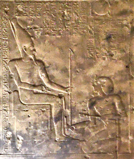 Scene 12 : Offering incense. The king holds a censer and pour water before an offering of foods. The ritual is guided toward the statue that is in the naos on the sacred boat. |