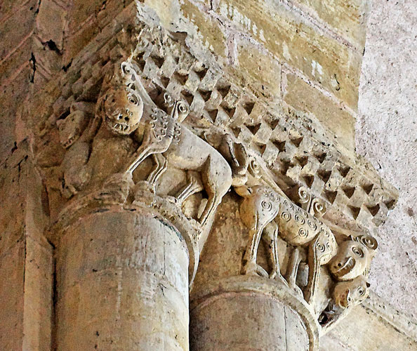 Les lions sont très stylisés et grimaçants. Sur le chapiteau de droite, deux lions sont tête à tête. Sur la petite face du chapiteau de gauche, une grenouille ou un crocodile montre les dents. Le lion peut être considéré comme un animal bienveillant ou malveillant, suivant les représentations. La grenouille ou le crapaud sont, sans conteste, des animaux diaboliques. |