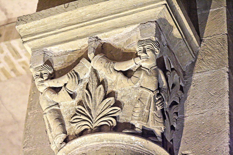 La physionomie de ces sonneurs (visages carrés, cheveux bien peignés) est caractéristique de l'atelier de sculpture du temps de l'abbé Begon. Ces sculptures sont très différentes de celles de l'atelier qui créa le tympan, nettement plus détaillé. L'olifant était utilisé pour communiquer durant les combats.