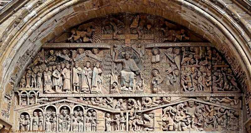 Ce bas-relief date du début du XIIème siècle. Cette période est marquée par l'apparition de véritables programmes sculptés au-dessus des portes des églises. Celui-ci est composé de trois registres séparés par des bandeaux comportant des inscriptions en latin. Au centre, la figure du Christ avec à sa gauche les damnés et à sa droite, les élus. C'est l'opposition du bien et du mal. Les scènes se déroulent de façon simultanée, permettant ainsi une lecture à l'interprétation facile.
