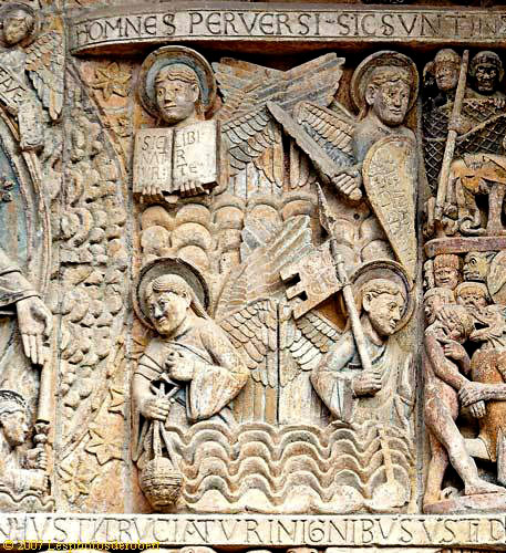 Les Anges séparent le Christ de l'enfer. Pour le protéger des démons, deux anges sont armés, l'un d'un bouclier et d'un glaive, l'autre d'une lance. |