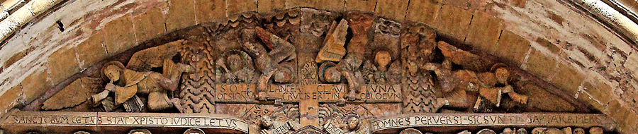 Au-dessus du Christ , se trouve la Croix de son martyre. Dans les cieux, le soleil et la lune sont représentés. Les bandeaux explicitent la scène : "Ce signe de Croix sera dans le ciel lorsque le seigneur viendra pour juger". (E. Vergnolle, 2005) |