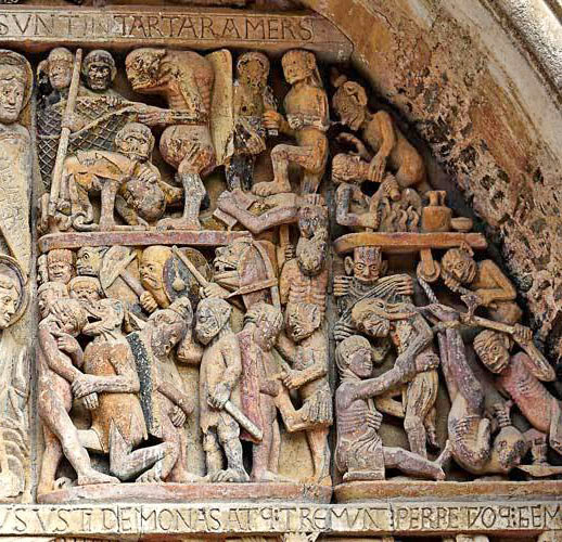 La partie supérieure de l'enfer est divisée en deux registres. En bas, à gauche, un roi découronné s'étonne de ne pas être parmi les élus qu'il montre du doigt. A droite, des démons dépècent un homme. Au-dessus, un faux monnayeur , reconnaissable à son poinçon, est contraint d'avaler du métal fondu. En haut, à gauche, on peut voir un mauvais moine, crosse à terre. |