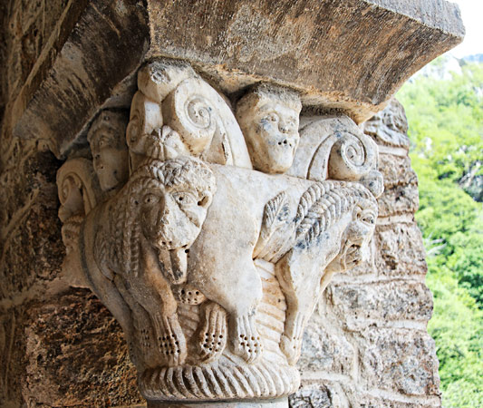 | Ces chapiteaux sont directement inspirés de chapiteaux de la galerie de Serrabona, quoique avec moins de détails et moins travaillés. Ci-dessus des lions et ci-dessous des aigles. |