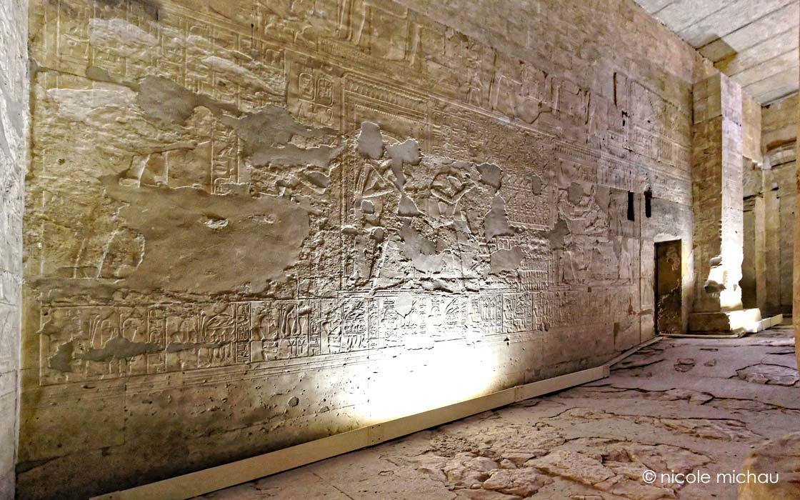 La paroi Sud de la 2ème salle hypostyle est malheureusement dégradée. Sur le registre du haut, les scènes sont fragmentaires : à gauche, on devine la partie inférieure de la scène de la présentation des 4 veaux et on y voit à droite la barque de Sokar. Sur le registre du bas, Sethy est représenté divinisé, comme dans sa chapelle : il reçoit les hommages des dieux. À droite, deux portes permettent d'accéder l'une au complexe de Nefertoum-Sokar et l'autre au couloir des Annales. Ces différentes parties sont détaillées dans 2 pages annexes (voir ci-dessous). |