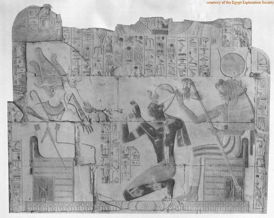 En-haut, Isis (placée du côté de sa chapelle) tient la couronne khepresh sur la tête du roi qui fumigène de l'encens pour Osiris. Isis porte la coiffure hathorique.