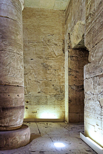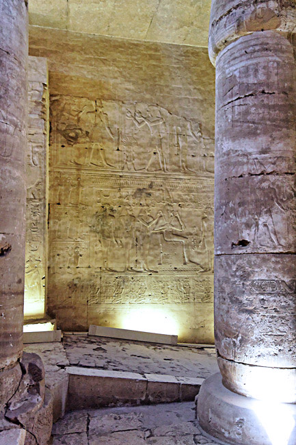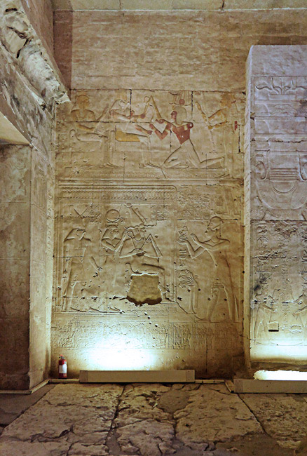 Les scènes du mur nord sont réparties sur deux registres. Les scènes du bas sont les mieux préservées et comportent les gravures les plus fines de tout le temple. Elles mettent toutes en scène Osiris et le roi Sethy 1er. Les scènes du haut sont incomplètes. Vous pouvez accéder aux scènes du registre inférieur soit en utilisant la barre de navigation ci-dessous, soit en cliquant sur une partie des images. |