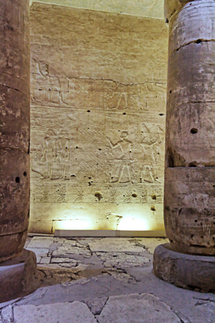 Cette partie du mur comporte des scènes assez rermarquables, avec l'offrande de la Maât , le pilier et la scène avec Osiris et les 5 déesses. Vous pouvez accéder aux scènes du registre inférieur soit en utilisant la barre de navigation ci-dessous, soit en cliquant sur une partie des images. |