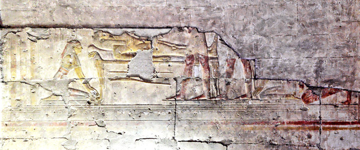 Mur ouest de la chapelle A : le roi tient une petite chapelle sur laquelle sont dessinés deux petits rois adorant deux déesses vaches. Devant lui, Osiris et Isis ( cf. R. David) |