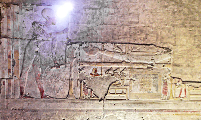 Mur Est : le roi se tient devant une barque sacrée. Il tient un rouleau dans la main gauche et lève la main droite. De petits rois sont dessinés en-dessous de la barque. |