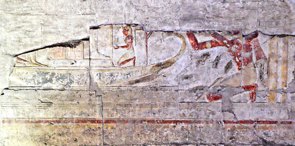 Mur Ouest : Le roi est agenouillé devant une barque sur laquelle on devine la présence de plusieurs personnages, dont sans doute Osiris. Un petit roi est agenouillé sur la barque. |