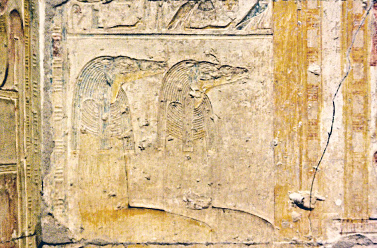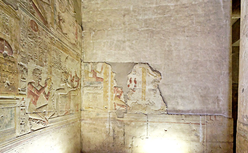 Le panneau du mur sud est pratiquement inexistant. Le roi est à genoux devant une divinité. Derrière lui, en bas, deux dieux crocodiles que vous pouvez voir en dessous. [retour Mur est]