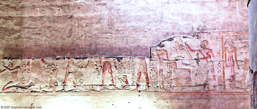 Cette partie du mur est très abîmée. A droite, reprise de la scène avec Hapi et Mâat. Ensuite, le roi oint Osiris et Isis comme dans une scène précédente. Puis des scènes incomplètes. |