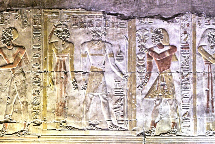 A droite, reprise d'une scène du panneau précédent, puis une scène avec Hapi et Mâat. Les figures, les pieds, les mains ont été martelés, peut-être pendant la période chrétienne. Ensuite, le roi oint Osiris et Isis comme vous pouvez le voir ci-dessous. |