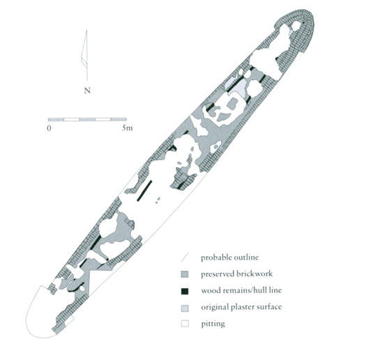 Les bateaux : Ces 14 tombes de bateaux sont réunis en une véritable flotte. Elles ont été datées de la 1ère dynastie. C'est une découverte unique en son genre. Chaque tombe est constituée de briques. La structure suit le bateau à l'intérieur et prend donc elle-même la forme d'un bateau, la proue et la poupe étant clairement visibles. Ces superstructures sont assez basses, de l'ordre de 50 cm. Elles sont placées les unes à côté des autres, séparées par des intervalles de 60 cm à 1,60 m. L'orientation est la même por toutes, reproduisant celle des enclos. Construites en une seule fois, elles étaient dédiées à un seul roi, celui du Western Mastaba, dans la 1ère Dynastie. A l'intérieur, se trouvent les restes de bateaux en bois, comme on peut le voir sur le dessin ci-dessus tiré du livre de O'Connor (2009). Les tombes des bateaux 2 et 3 sont plus longs et ont des proportions plus élégantes. Le bateau dans la tombe n°10 , ainsi qu'autre étaient peints en jaune à l' extérieur. Certains croient que ces bateaux étaient fonctionnels, et non pas des maquettes : Ils n'avaient pas de voile, mais possédaient jusqu'à 30 rameurs. (0'Connor, 2009) [retour]
