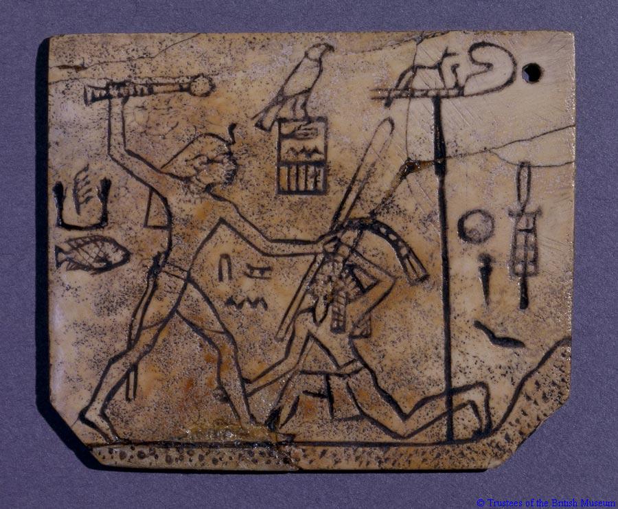 Sur cette étiquette en ivoire, le roi porte une coiffure archaïque avec un uraeus. Une queue de boeuf , symbole de fertilité, est attachée à sa ceinture. Avec une massue, il se prépare à frapper un captif. L'ennemi est un asiatique, comme l'indique sa barbe. Devant le roi, son nom est inscrit dans un serekh. Oupouaout se dresse sur un pavois. Cette étiquette était attachée à une paire de sandales, dessinées sur l'autre face de cette étiquette.. Elle a été trouvée par Amélineau lors de ses fouilles de 1895-1896. (cf. la page biblio).
