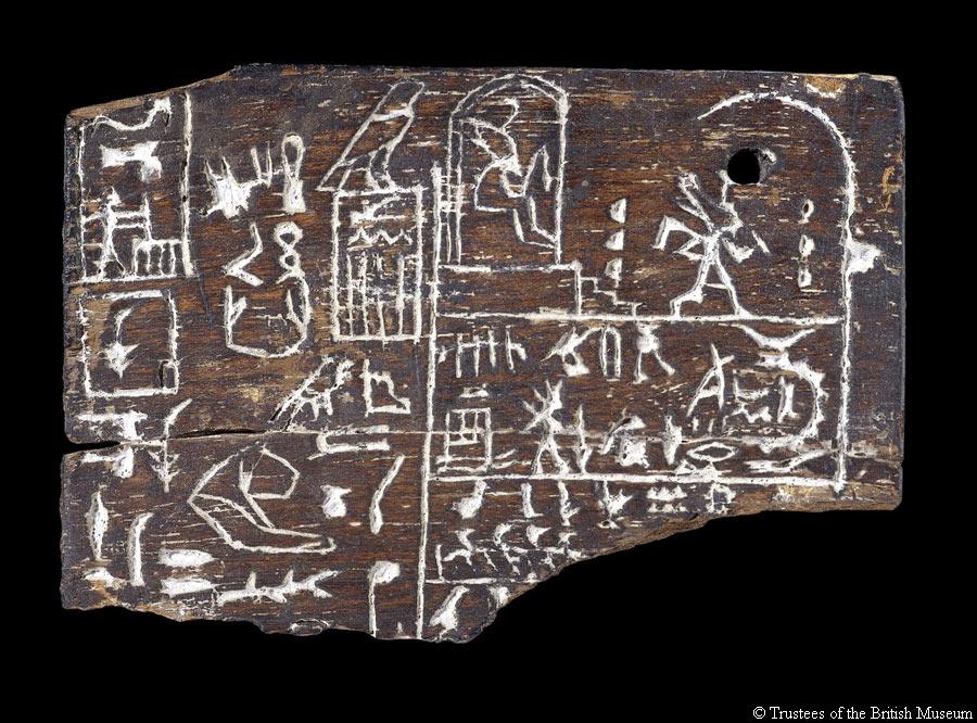 Cette étiquette a été découverte par Petrie lors de ses fouilles des tombes des rois de la 1ère dynastie.(voir la page biblio). Il s'agit probablement d'une étiquette attachée à une jarre. Elle représente le jubilé ou heb-sed du roi Den, dont le nom est inscrit dans le serekh. Dés cette époque, le jubilé du roi comporte les différentes phases qui se perpétueront au cours des siècles, pour différents rois : construction d’un pavillon spécial au sommet d’une estrade à double rampe, course du roi... Le roi porte alternativement la couronne de Basse et Haute Égypte. Vous pouvez accéder en cliquant à la page du British Museum consacrée à cet objet.