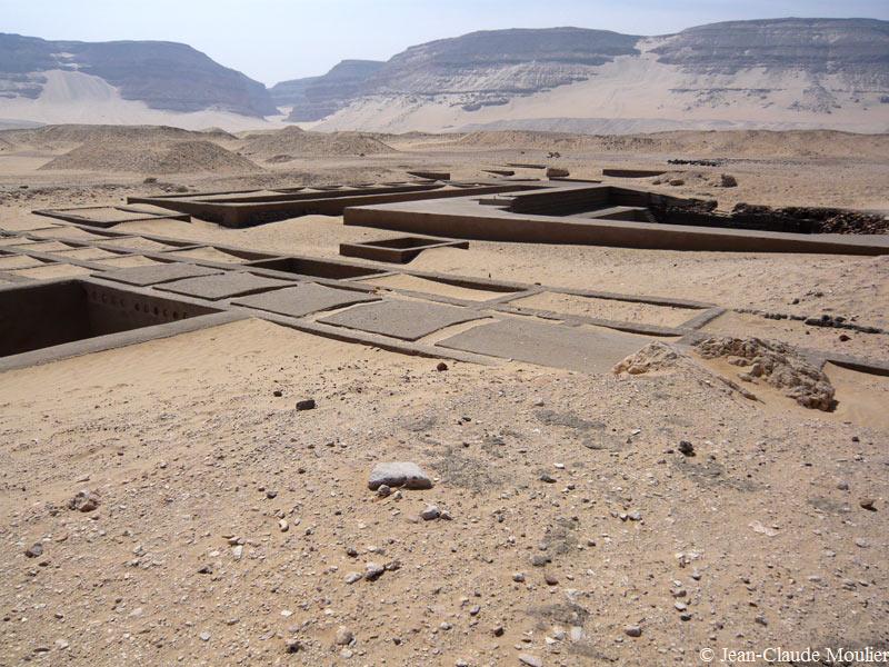Tombe du roi Den à Umm-el-Qaab : La tombe est en haut à droite. Les tombes annexes sont clairement visibles.