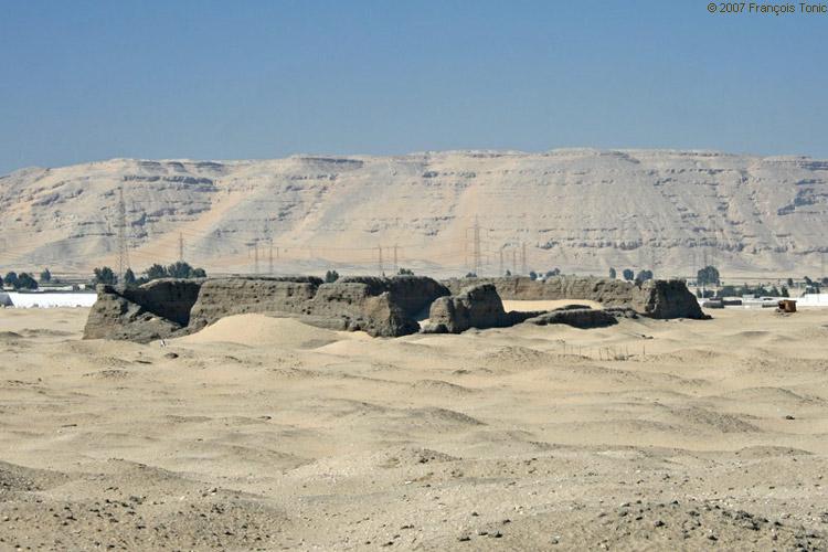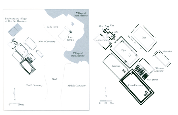 Les enclos : .Extraits du livre de O'Connor, ces deux vues offrent un résumé de l'ensemble des enclos. Au total, 10 enclos ont été découverts, ainsi que 14 tombes contenant des bateaux au milieu d'eux. Au nord-ouest, trois enclos, entourés de tombes subsidiaires ont été datés du roi Aha. A coté, un enclos "anonyme" d'environ 67 m par 37 m n'a pu être associé à aucun roi. Puis des enclos plus grands de différents rois ont été mis au jour. Le "Western Mastaba" a pu être daté de la 1ère dynastie, ainsi que les bateaux. Ces enclos comportaient des chapelles dans une partie de leur enceinte. Ces enclos et la nécropole étaient liés