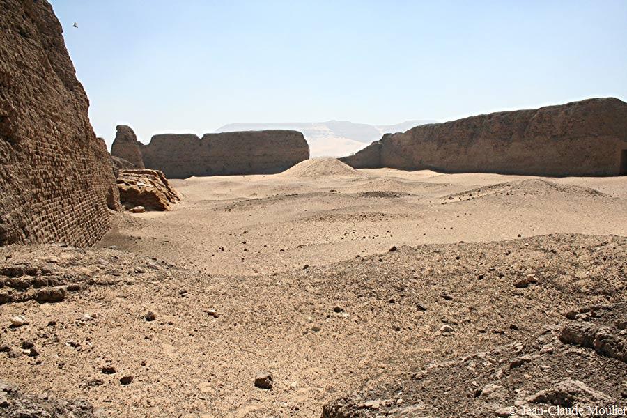 L'intérieur de Shunet-el-Zebib : dans cette vaste enceinte funéraire, les seuls vestiges sont ceux d'une chapelle, maintenant recouverte par le sable (au fond à gauche). Cette vue est prise du nord. On peut voir la porte à droite.