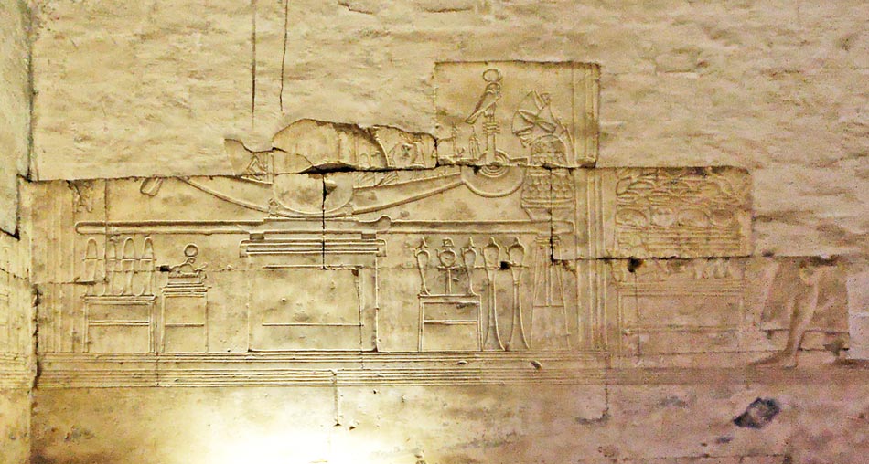 A droite, il ne reste que les pieds du roi qui se tient devant la barque de Ptah (A.R. David).