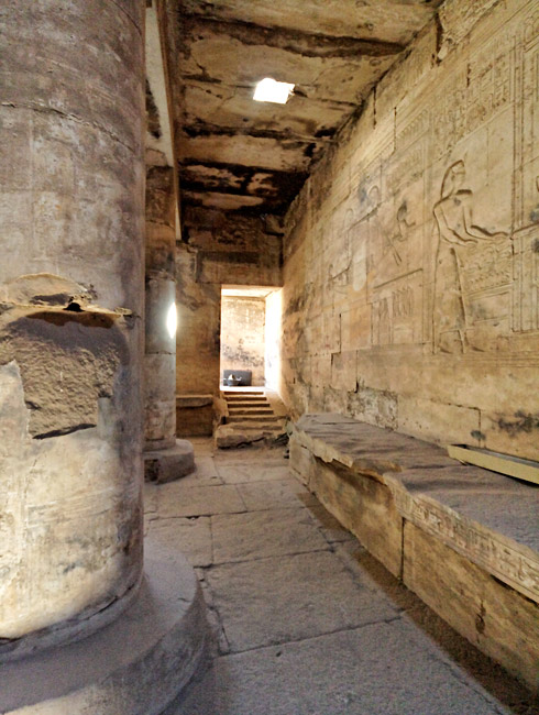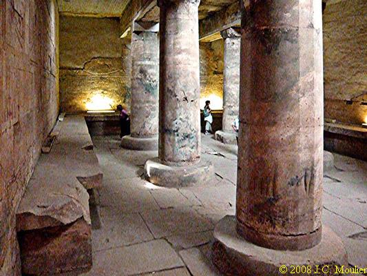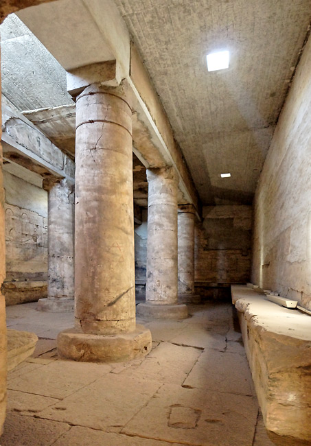 Le plafond de la salle est soutenu par six colonnes dont la décoration a pratiquement disparu. Une banquette court tout autour de la salle et il est possible qu'elle ait servi comme reposoir des barques sacrées. Sur les murs, 9 barques sont représentées et les noms de 7 d'entre elles ont été préservés. Dans le coin nord-est, un escalier permettait aux prêtres de monter sur le toit, la nuit pour observer les étoiles et déterminer l'heure, ou le jour pour les rites solaires.
