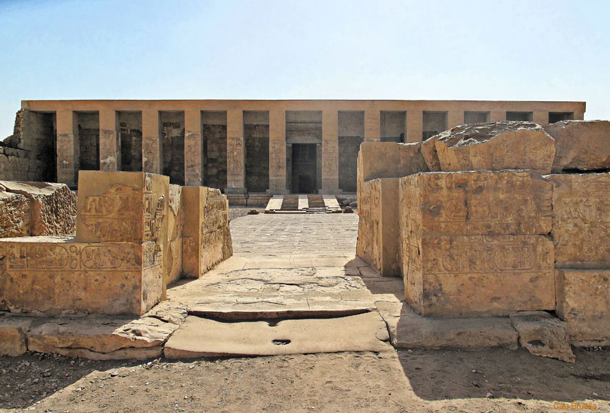 Vue de la 2ème cour depuis la 1ère cour : Il ne reste du pylône qui séparait les deux cours. La 2ème cour est bordée à l'ouest par le portique décrit dans une partie à part. Elle mesure environ 52 m dans le sens Nord-Sud et 42 m dans l'autre sens (Caufield, 1902).Elle comporte quelques scènes intéressantes, de nouvelles listes des fils et filles de Ramsès et deux stèles. sur les restes de mur de la porte centrale, sont gravées