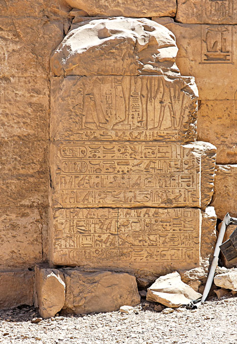 Stèle du mur sud : en haut, la scène est assez bien préservée. Le titre en est : Donner la Maât à Osiris. Osiris est suivi d'Isis et de deux autres divinités. Ensuite trois lignes avec la titulature de Ramsès commençant par : "Taureau puissant, aimé de Maât" (nom d'Horus), suivi des autres noms. La suite est un texte dédié à différents dieux.