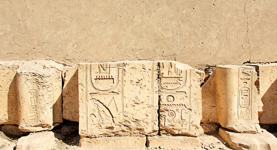 A gauche, le pilier de droite de la photo précédente. Sur le panneau, le nom de Mout à gauche et celui de Khonsou à droite.