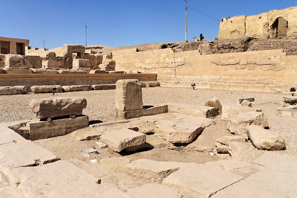Vue générale : sur cette vue, on voit mieux la structure de cette partie. Au premier plan, le second puits. Ensuite le renfort moderne soutenant la petite terrasse. Puis les restes des piliers et le mur ouest avec ses niches et la procession des filles de Ramsès. Une porte de communication existait entre les deux cours sur cette partie du mur( voir ci-dessous). |