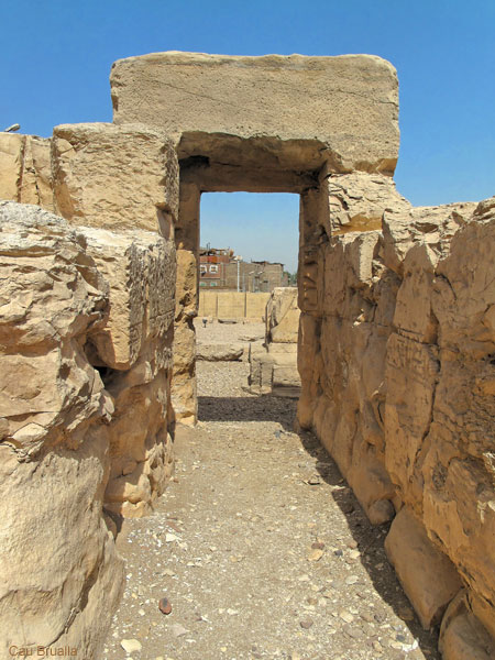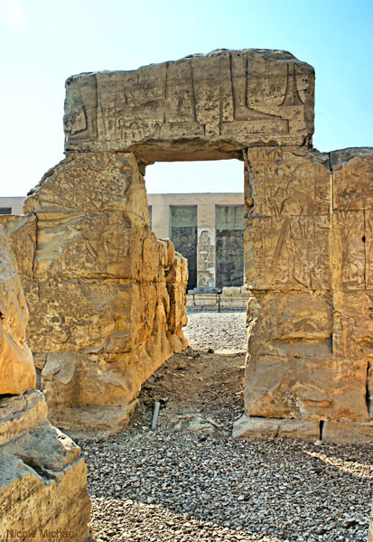 La porte : elle est insérée dans le défilé des filles de Ramsès, comme on peut le voir sur l'image de gauche, entre une princesse dont le nom est perdu et la princesse Merytmihâpy (voir plus loin). Dans le fond, on aperçoit le portique d'entrée du temple. L'image de gauche donne un aperçu de l'épaisseur des murs des restes du deuxième pylône. Sur le mur de la partie ouest de cette cour, se déroule la procession des filles de Ramsès , que vous pouvez voir avec le lien ci-dessous.