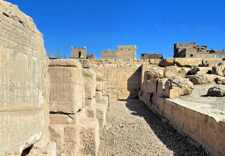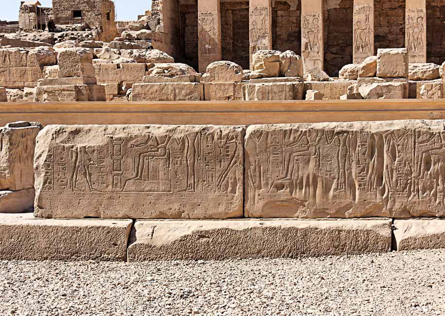 Partie ouest, côté sud : au premier plan, les blocs sont posés sur le tour du puits (ou bassin). Ils sont gravés de scènes d'offrandes avec le nom de Sethy 1er à droite et celui de Ramsès à gauche. Au deuxième plan, un renfort moderne soutient une petite terrasse . puis on voit les restes des piliers et du mur ouest. Au fond, le portique. |
