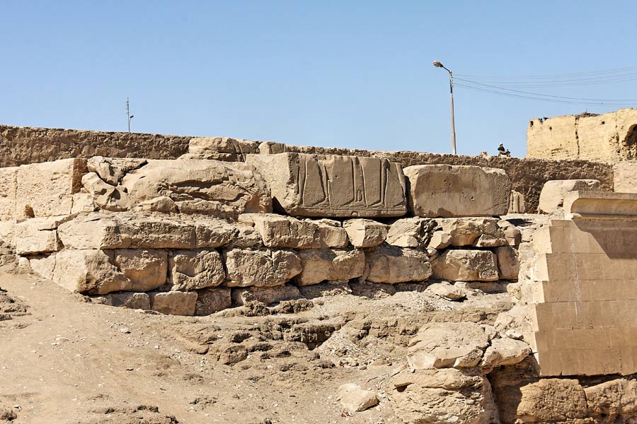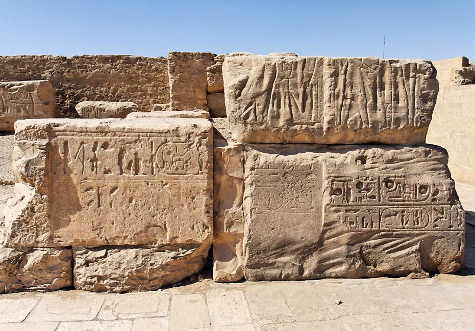 Exemple de restes du pylône : à droite de l'entrée de la première cour, ces restes du pylône ne montrent aucune scène intéressante. La partie à gauche montre quelques restes d'inscriptions et de scènes (voir ci-dessous).