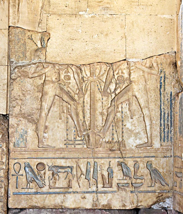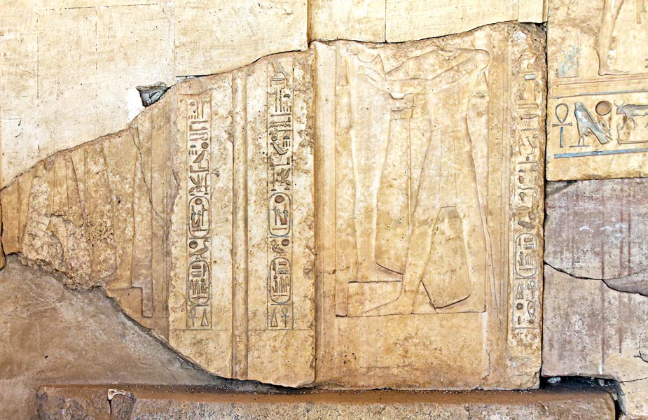 Les restes d'un beau Sema-Touy en albâtre fin occupent le mur du fond de la chapelle. En dessous, le nom d'Horus de Ramsès II: "..Taureau puissant, aimé de Mâat.." La titulature se poursuit avec le nom des Deux Maîtresses sur le mur adjacent que vous pouvez voir avec la barre de navigation ci-dessous. |