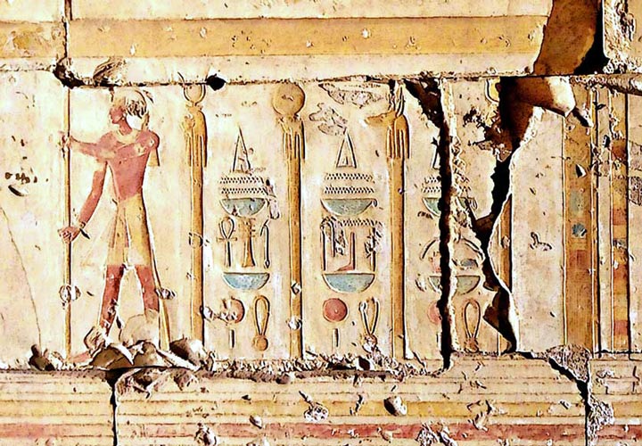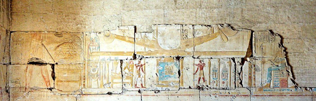 Mur Est : Le panneau a été reconstitué avec plusieurs photos. Ici le roi doit probablement offrir de l'encens. Sur le socle, est inscrit le nom de Ramsès II. Ici pas de scarabée, mais trois enseignes que vous pouvez voir ci-dessous. Il ne reste qu'une déesse, Nout.