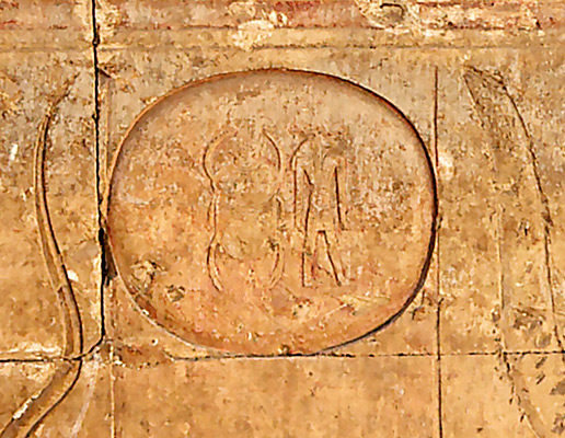 la Litanie est précédée d'une figure de titre que vous pouvez voir ci-dessus, telle qu'elle est dans cette chapelle G. Elle réunit le scarabée et le dieu à tête de bélier, dans un disque qui fait fuir des forces mauvaises, serpent ou crocodile (d'après E. Hornung, cf. biblio). Dans une autre interprétation, le serpent et le crocodile protégeraient le disque ou seraient des émissaires du soleil (Corteggiani, 2007). Les deux reptiles sont accompagnés de têtes d'antilope . D'autres scènes accompagnent cette scène centrale.