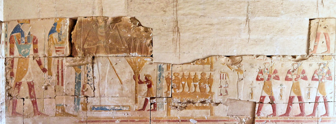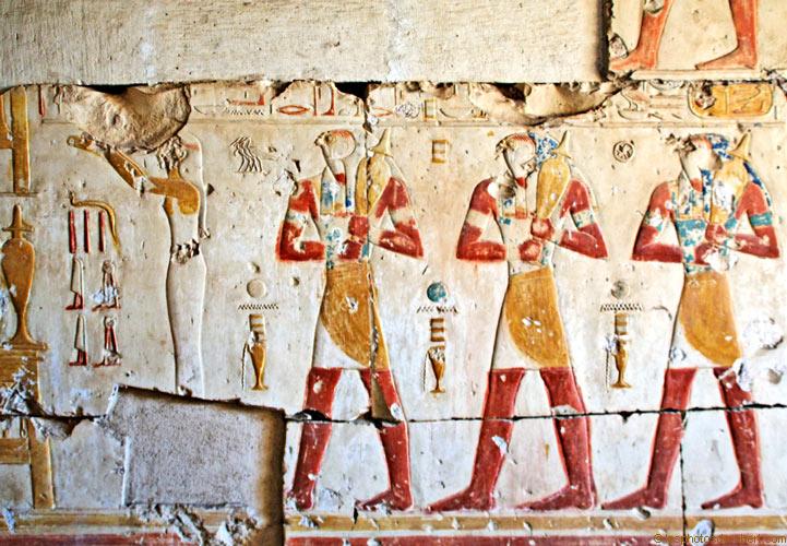 La déesse Meret rend hommage aux trois dieux. Les âmes des dieux de Nekhen la suivent : il manque le haut de la scène avec,sans doute, les âmes de Pe. Trois petits Bâou précédent les âmes de Nekhen. |