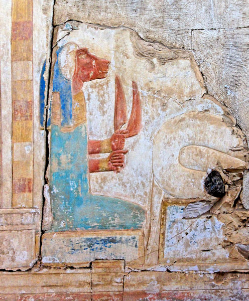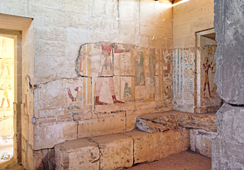 Cette chapelle occupe le coin nord-ouest du temple. Elle comporte une série de niches destinées sans doute à recevoir des statues, d'où le nom de la chapelle. Une banquette très détériorée court tout autour de la chapelle. Par la porte, on aperçoit la chapelle L. Sur le mur, une scène d'offrandes, très probablement à Osiris et Isis. Cette scène était entourée de vignettes représentant des singes armés de couteaux dont vous pouvez voir une représentation ci-dessous.