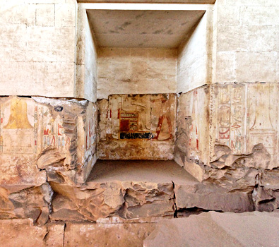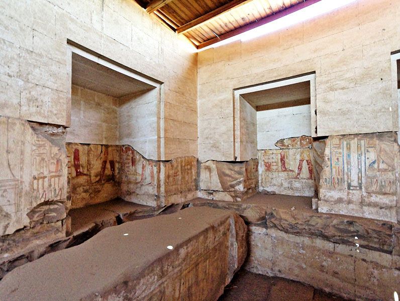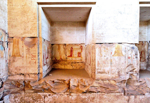 La dernière niche du mur du fond et une niche du mur de droite. Toutes les niches de cette pièce devaient contenir des statues. La niche de gauche est dédiée à Nout et Seb (?) (montant de gauche) et à Oupouaout (Mariette). Les montants de la niche de droite (la n° 7 de Mariette) sont détruits, sauf un.